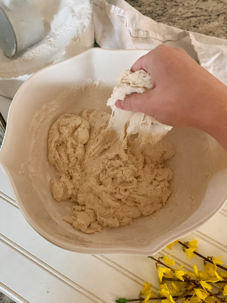- To ensure that your dough has been worked enough, you can test this by doing the “Window Pane” test. This is done by pulling a piece of dough up and stretching with both hands. If you can see through it, you are good to go.
